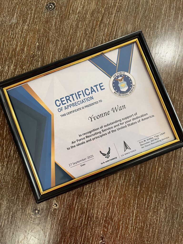 Thank you TSGT Sobba for presenting Yvonne Wan, our Focus comic creator and Teaching Artist a USAF certificate of appreciation. It says: “In recognition of outstanding support of Air Force recruiting service and for your dedication to the ideals and principles of the United States of America”.